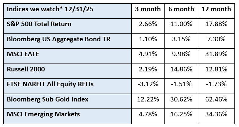 We at Bryant & Brannock miss 2025 already. It was a tumultuous year in many respects, but it delivered a steady supply of positive returns across a broad range of asset classes. Global real estate was one of the only sectors that was negative for the year, and it was down by less than 2%. US domestic equities, both large and small cap, were up by double digits. International equities, both developed and emerging markets, were up even more than US equities. The Bond markets had another good year, and gold – the ‘safe-haven’ asset – was up an astonishing 62%. 2025 was a very good year to be invested.